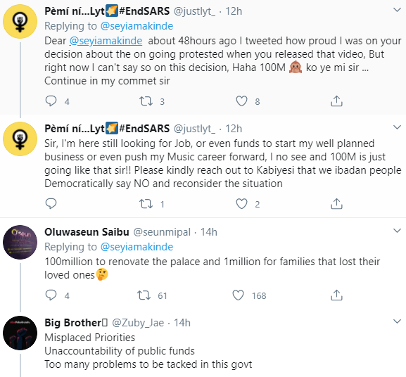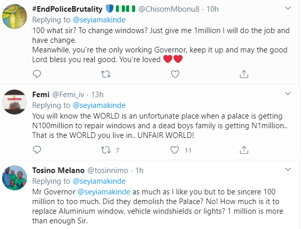Hours after Seyi Makinde of Oyo state announced he was donating the sum of N100 million for the renovation of Soun of Ogbomoso’s palace after it was ravaged during the protest while offering the families of slain victims the sum of N1million, Nigerians have taken to social media to lambast the governor while accusing him of having misplaced priorities.
