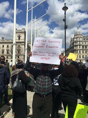 Nigerians residing in London are presently staging a protest over the increasing rate of herdsmen attack in some parts of Nigeria. Carrying placards with various inscriptions, the Nigerians are calling for a quick intervention by the Federal government.