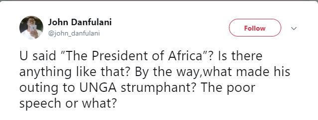 She wrote: ‘Our President, The President of Africa, Muhammadu Buhari, Returns home after a Triumphant Outing At the #UNGA2017.’