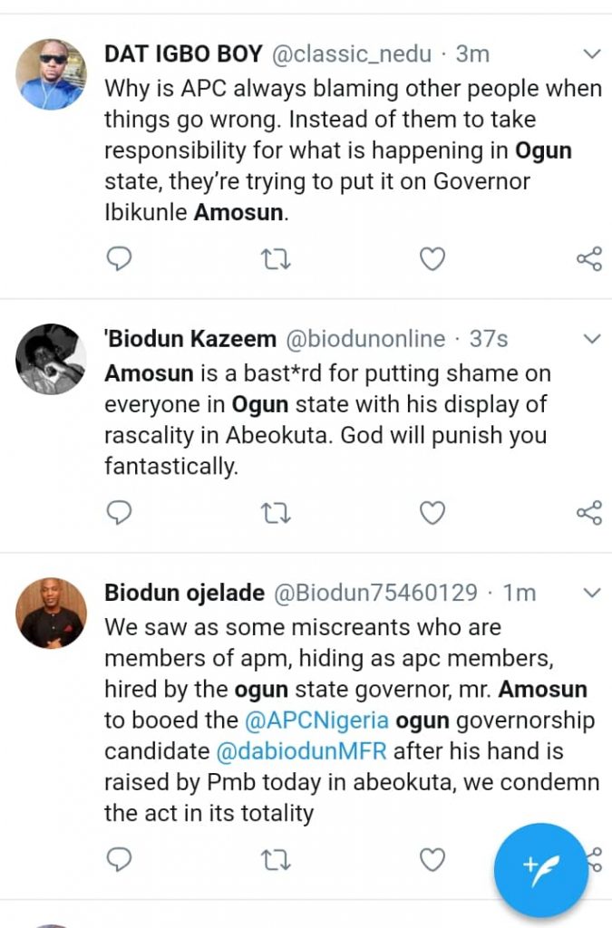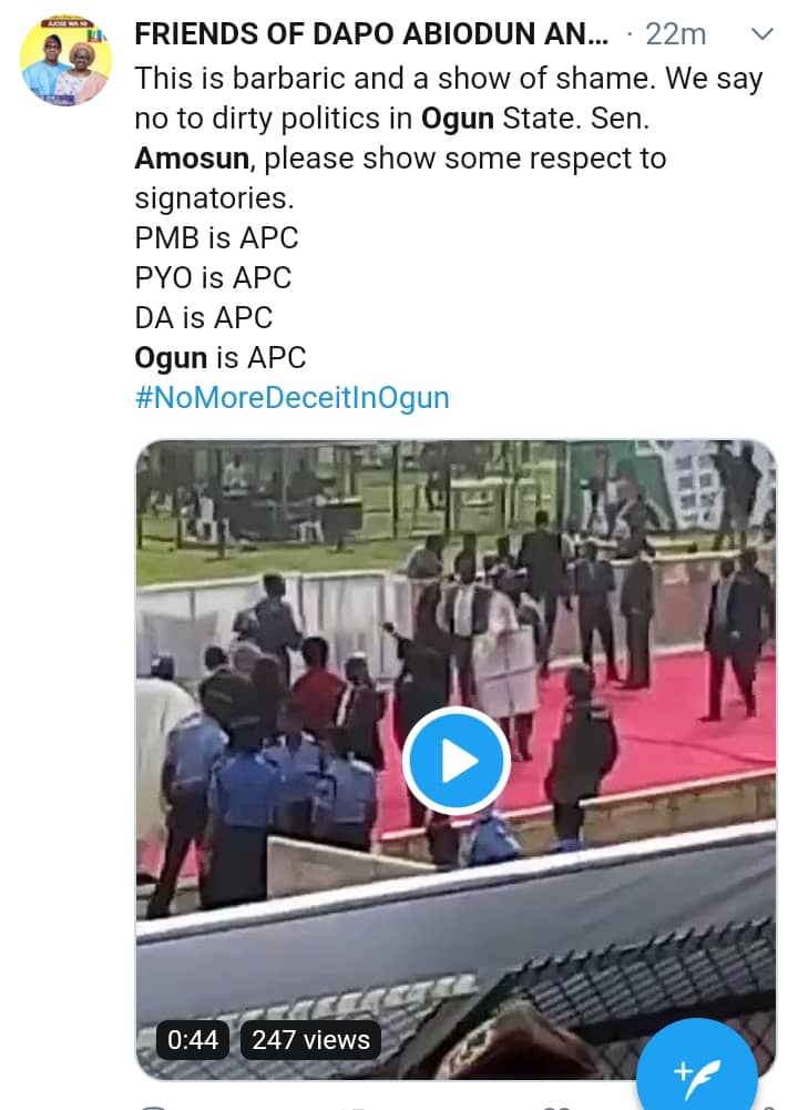 The Ogun state Governor, Ibikunle Amosun, was accused of personally supervising the disruption of the ongoing APC campaign rally in Ogun state, by ordering the removal of banners belonging to the APC gubernatorial aspirant, Dapo Abiodun. #PMBInOgun