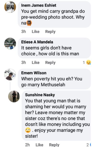 Nigerians have reacted over the prewedding photos of the young woman and her older lover who struck poses together in anticipation of their big day.