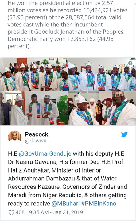 Buhari’s campaign train stormed Kano state on Thursday, January 31, in continuation of his reelection bid ahead of the forthcoming general elections – The president won election in the state with 1,903,999 votes in 2015 The governors of Zinder and Maradi from Niger Republic were among the dignitaries that attended the mega rally of President Muhammadu Buhari in Kano, Daily Trust reports. This was revealed in a tweet by Salihu Tanko Yakasai, the media aide of Governor Abdulahi Ganduje of Kano on Thursday, January 31. Legit.ng gathered that Buhari who is seeking a second term in office, won 1,903,999 votes in Kano state in 2015.