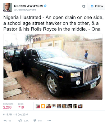 “Nigeria illustrated – An open drain on one side, a school age street hawker on the other, & a Pastor & his Rolls Royce in the middle. – Ona”A lot of Nigerians reacted to the tweet with mixed feelings.