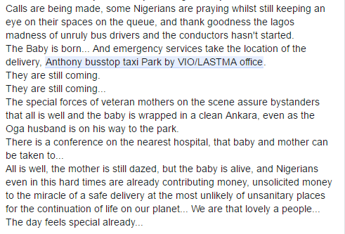 A woman went into labour early morning today, before 7:00am at Anthony busstop taxi Park by VIO/LASTMA office, Lagos