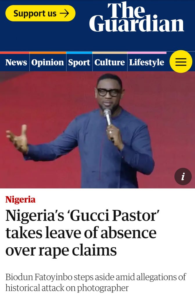 The news of the rape allegation against COZA pastor, Biodun Fatoyinbo which was leveled against him by singer Timi Dakolo’s wife, Busola Dakolo, has gone international and published by The Guardian UK.