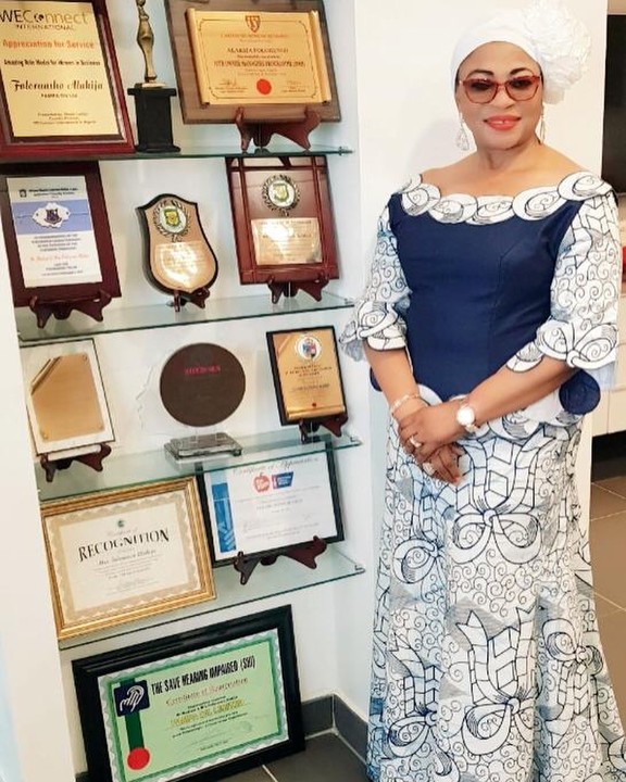 Nigeria’s Richest woman, Folorunsho Alakija is absolutely looking stunning in this native dress as she poses with her numerous awards.