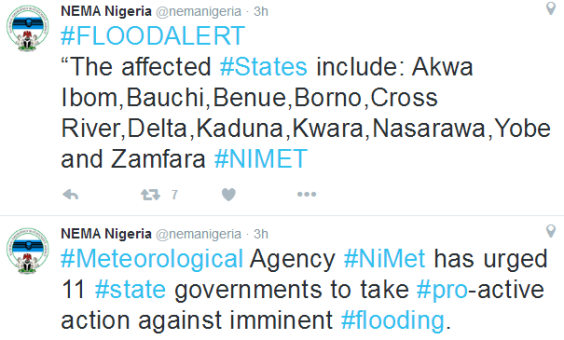 The Nigerian Meteorological Agency has issued flood alert to 11 states and has asked the state governments to take proactive measures to prevent the imminent flood.