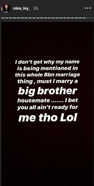 “I don’t get why my name is being mentioned in this whole BBN marriage thing. Must I marry a big brother housemate? I bet you all ain’t ready for me though lol,” she wrote on Thursday.