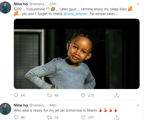 In her response on Friday morning October 18, Nina simply Tweeted, ‘Still sleeping please don’t wake me up. $200 … Yudunminit? Later guys. Lemme enjoy my sleep biko’.