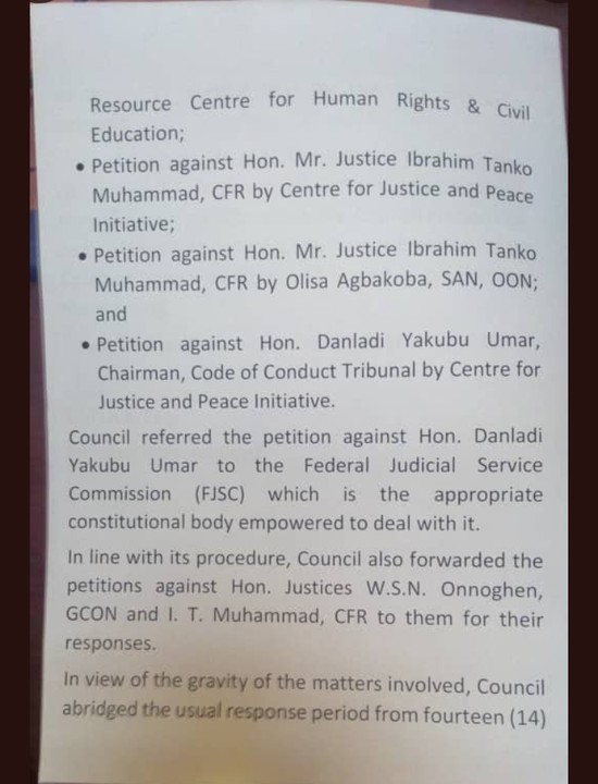 Refers Petition written against CCT Chairman, Danladi Umar to Federal Judicial Service Commission.