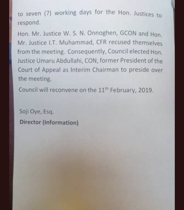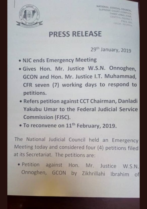 NJC ends emergency meeting, givesJustices Walter Onnoghen and Tanko Muhammad, seven working days to respond to petitions written against them.
