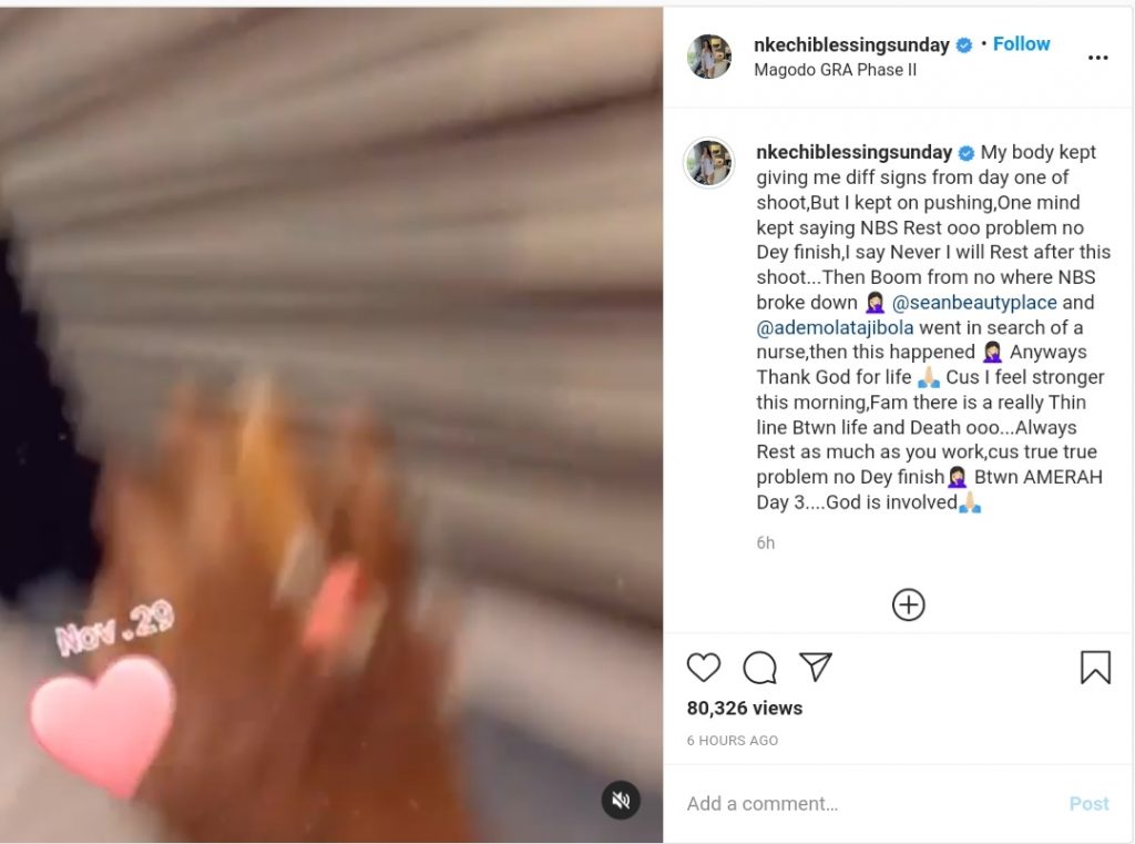 “My body kept giving me diff signs from day one of shoot,But I kept on pushing,One mind kept saying NBS Rest ooo problem no Dey finish,I say Never I will Rest after this shoot,” she wrote on Monday.