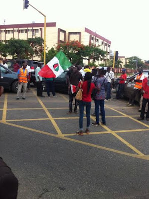 Nigeria Labour Congress in Lagos State took their protests to the Lagos State Secretariat, Alausa, Ikeja, today. According to reports, they blocked a junction leading to the secretariat, then entered the premises and began disturbing government activities by harassing workers for not obeying the announced strike action. Officers from the Rapid Response Squad were immediately deployed to handle the situation. More photos after the cut.