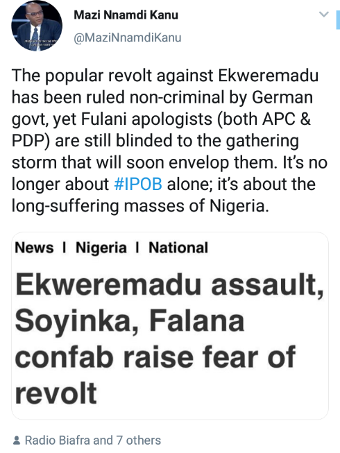 “The popular revolt against Ekweremadu has been ruled non-criminal by German govt, yet Fulani apologists (both APC & PDP) are still blinded to the gathering storm that will soon envelop them. It’s no longer about #IPOB alone; it’s about the long-suffering masses of Nigeria,” he said.