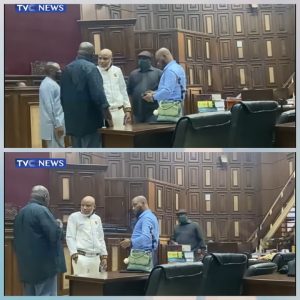 Nnamdi Kanu arrives court, confronts DSS officials over refusal of some members of his legal team access into the court room.