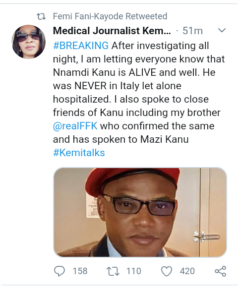 After investigating all night, I am letting everyone know that Nnamdi Kanu is ALIVE and well. He was NEVER in Italy let alone hospitalized. I also spoke to close friends of Kanu including my brother @realFFK who confirmed the same and has spoken to Mazi Kanu