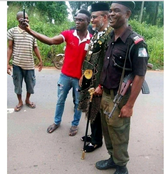 A picture of the captured Mazi Nnamdi with a police officer smiling. The picture also shows a villager who seemed to ask Kanu for a picture.