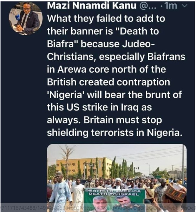 What they failed to add to their banner is “Death to Biafra” because Judeo-Christians, especially Biafrans in Arewa core north of the British created contraption ‘Nigeria’ will bear the brunt of this US strike in Iraq as always. Britain must stop shielding terrorists in Nigeria.
