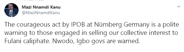 He tweeted, “the courageous act by IPOB at Nürnberg Germany is a polite warning to those engaged in selling our collective interest to Fulani caliphate. Nwodo, Igbo governors are warned.”