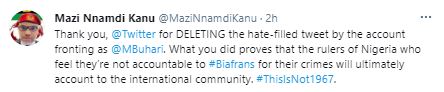 Nnamdi Kanu wrote: “Thank you, @Twitter for DELETING the hate-filled tweet by the account fronting as @MBuhari. What you did proves that the rulers of Nigeria who feel they’re not accountable to #Biafrans for their crimes will ultimately account to the international community. #ThisIsNot1967.”