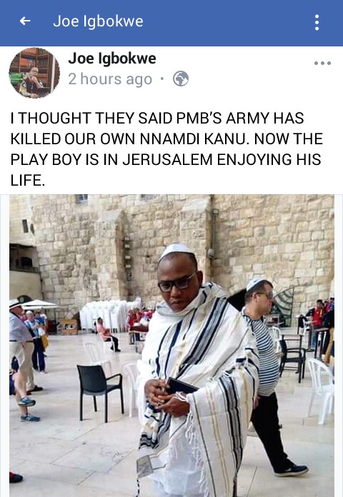 “I thought they said Pmb’s army killed our own Nnamdi Kanu. Now the play boy is enjoying his life in Jerusalem”