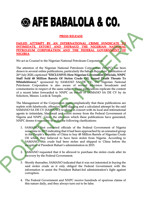 But for the due diligence of the management of the NNPC, the Federal Government would have lost a whopping sum of $125,000,000:00 (One Hundred and Twenty-Five Million United States Dollars) to this international crime syndicate. The NNPC is currently consulting its lawyers Afe Babalola & Co. in a bid to take corresponding legal action(s) against the said syndicate for damages done to its reputation and its officials as a result of the false publications by the syndicate.