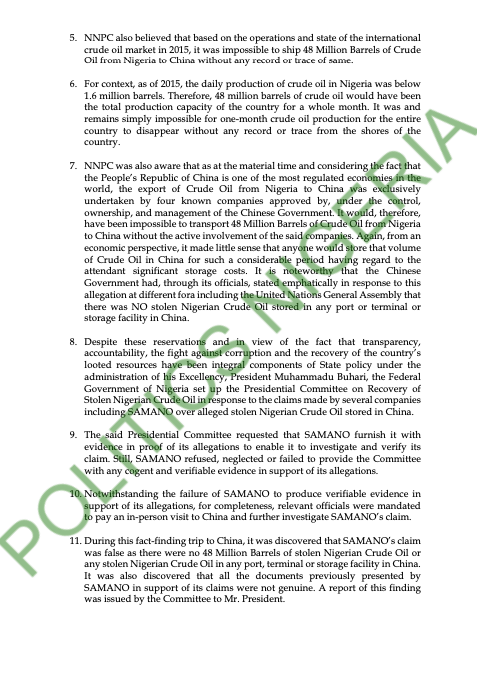 POLITICS NIGERIA gathered that SAMANO had contacted officials of the Federal Government of Nigeria sometime in 2015 with information in respect of 48 Million Barrels of Nigerian Bonny Light Crude Oil allegedly stolen from Nigeria and stored in various ports and terminals in the People’s Republic of China. SAMANO offered to purchase the alleged stolen crude upon its recovery.
