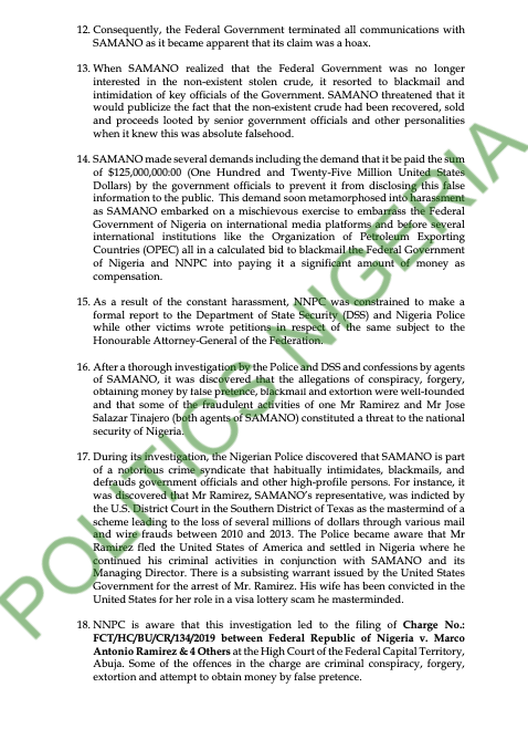 The said Mr. Ramirez and his cohorts have since been charged to several courts in Nigeria for criminal offences ranging from fraud, forgery, extortion, blackmail, conspiracy, etc. The charge which relates to the attempt to fleece the Federal Government and NNPC is Charge No.: FCT/HC/BU/CR/134/2019 between the Federal Republic of Nigeria v. Marco Antonio Ramirez & 4 Others pending before the High Court of the Federal Capital Territory Abuja.