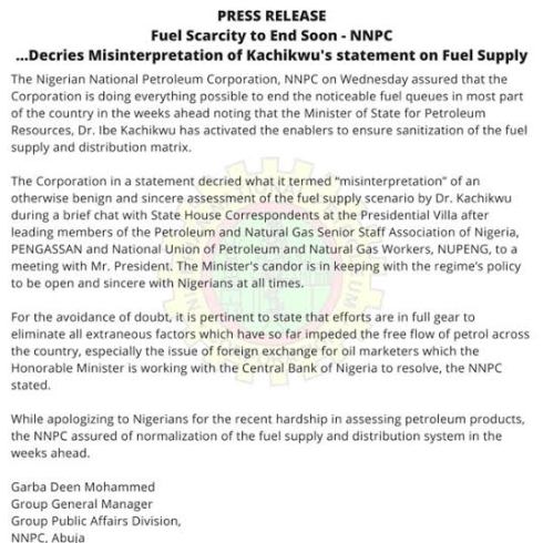 NNPC released this statement this morning, assuring Nigerians that fuel scarcity will end in the weeks ahead.
