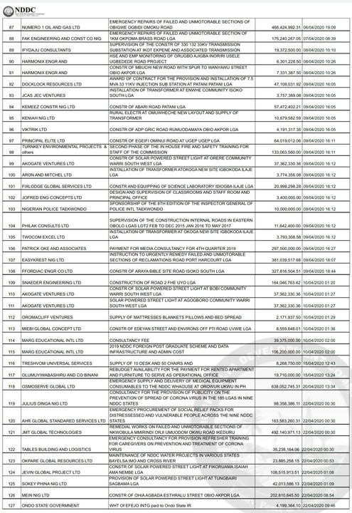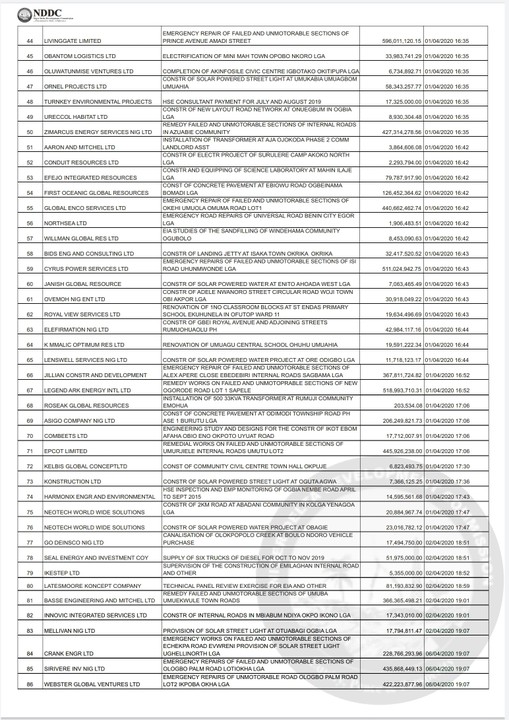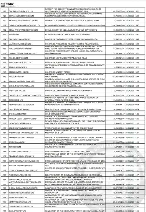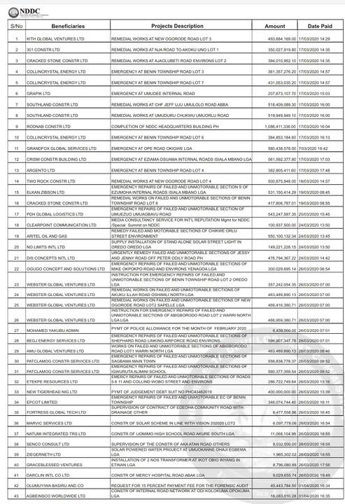 We are therefore taking the unusual step of publishing ALL payments made by the Commission between February 20, when the expanded IMC came into office and May 5 when the allegations were made. The list covers the beneficiaries of the payments, the projects which they executed and for which the commission had a contractual obligation to pay, the amount paid and the date and time of payment. The IMC has only paid out N35.3 billion to vendors and contractors within the period. The debts paid cover historical debts to vendors, some of whom have been owed between N1 million and N3 million, for up to eight years. The payments were intended to save lives and livelihoods as well as alleviate the suffering in the region.