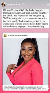 “Tv presenter, Moet Abebe has hailed actress, Ini Edo, for having a baby through surrogacy.
