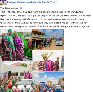 “The New Iwoland !!!! This is the true love of a king from his people and no king in the world and i repeat…no king on earth has got the respect of his people like i do cos i serve them day, night, morning and afternoon …. I can walk anytime among hundreds and thousands of them without security and they will protect me cos of their love for me !!! I love you my Great people of Iwoland, we are building a new future together. ”