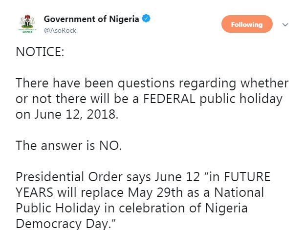 Presidential Order says June 12 “in FUTURE YEARS will replace May 29th as a National Public Holiday in celebration of Nigeria Democracy Day.”