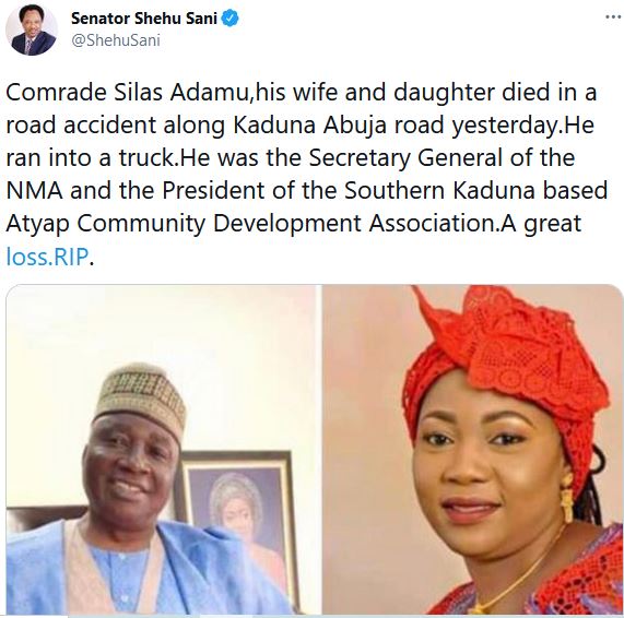 Senator Shehu Adamu while reacting to the sad news via his Twitter handle, wrote; ”Comrade Silas Adamu,his wife and daughter died in a road accident along Kaduna Abuja road yesterday.He ran into a truck.He was the Secretary General of the NMA and the President of the Southern Kaduna based Atyap Community Development Association.A great loss.RIP.
