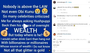 “Nobody is above the LAW. Not even Obi Kunu. So many celebrities criticized Me for always asking Hushpuppi Back then his source of overnight WEALTH But today where is he?