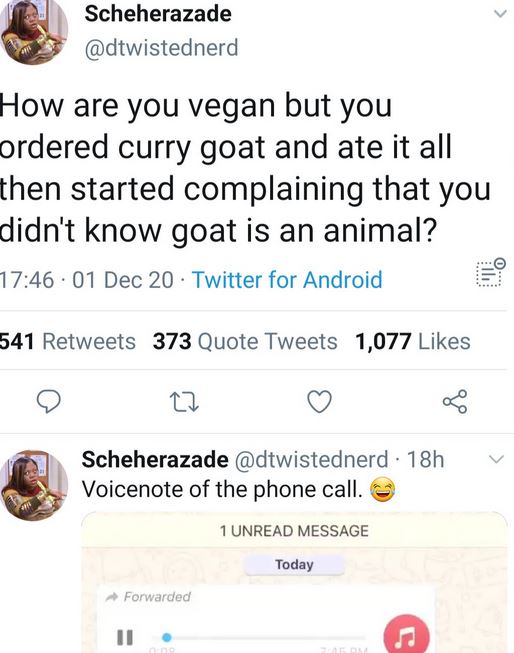 A vegan woman has called out a restaurant for serving her curry goat after she ordered the dish.