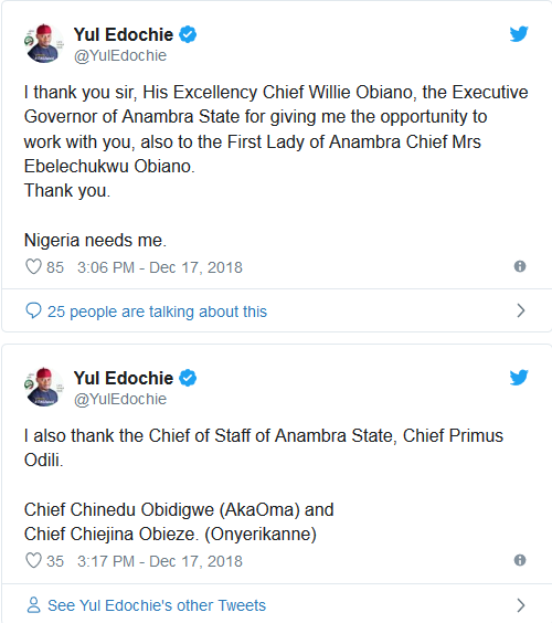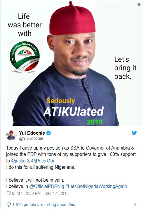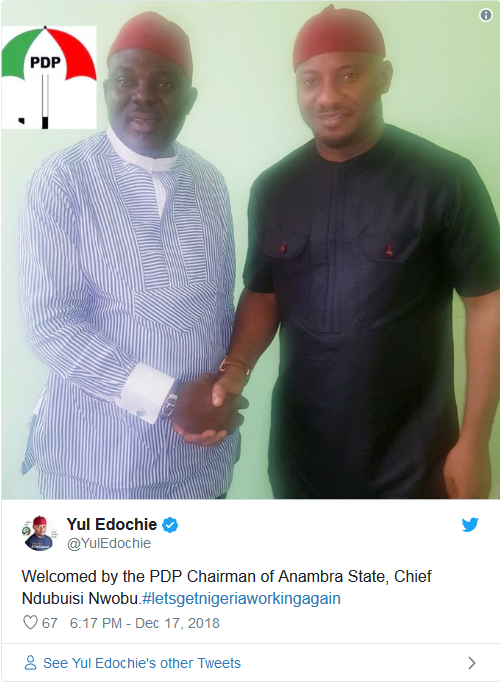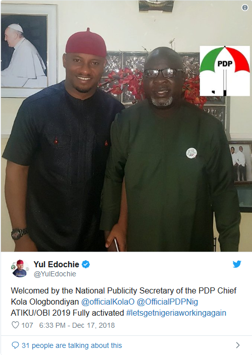 Nollywood actor-turned politician, Yul Edochie, has taken to his Twitter page to reveal that he has joined the Peoples Democratic Party (PDP), his third political affiliation in less than two years. The Anambra state-born movie star, also announced his resignation as the senior special assistant (SSA) on creative and entertainment media to Willie Obiano, Anambra governor. Yul who said his decision to join the PDP and support the presidential ambition of Atiku Abubakar, is for the sake of Nigerians, adding that he believes in the PDP’s agenda for the country. He tweeted: “Today I gave up my position as SSA to Governor of Anambra & joined the PDP with tons of my supporters to give 100% support to @atiku & @PeterObi.“I do this for all suffering Nigerians. I believe it will not be in vain I believe in @OfficialPDPNig“I thank you sir, His Excellency Chief Willie Obiano, the Executive Governor of Anambra State for giving me the opportunity to work with you, also to the First Lady of Anambra Chief Mrs Ebelechukwu Obiano.“Nigeria needs me. I also thank the Chief of Staff of Anambra State, Chief Primus Odili.”