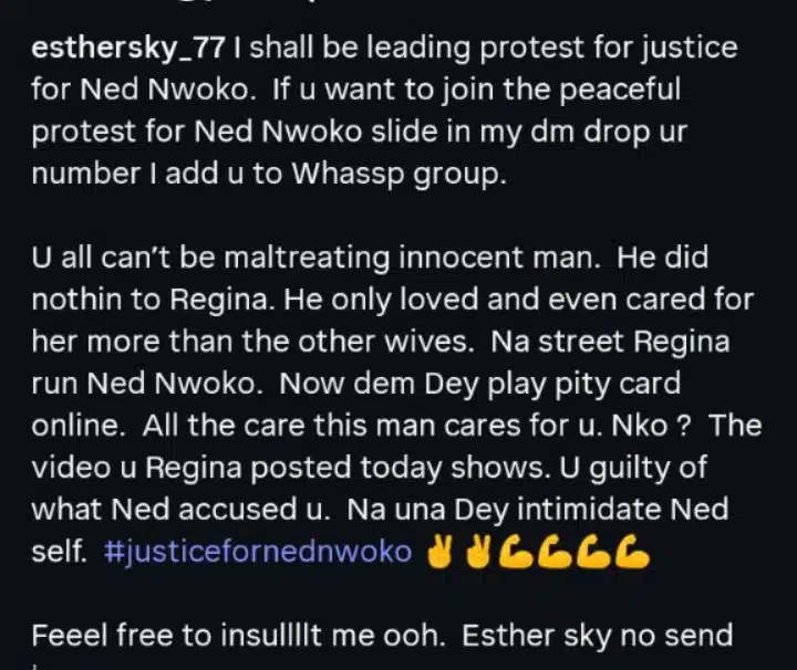 Controversial Nollywood actress, Esther Sky has announced plans to protest in defense of Senator Ned Nwoko, accusing Regina Daniels of intimidation