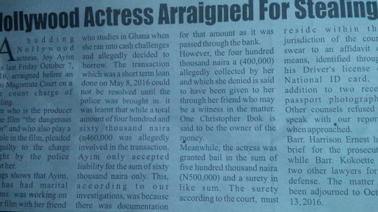 Reports emanating from Akwa Ibom State indicate that the actress was arraigned in Uyo on October 7th, 2016 for theft, in Magistrate court 6.