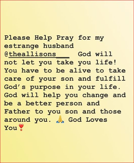 She wrote “Please help pray for my enstranged husban @theallisons__ God will not let you take your life! You have to be alive to take care of your son and fulfil God’s purpose in your life. God will help you change and be a better person and Father to your son and those around you. God loves you.”