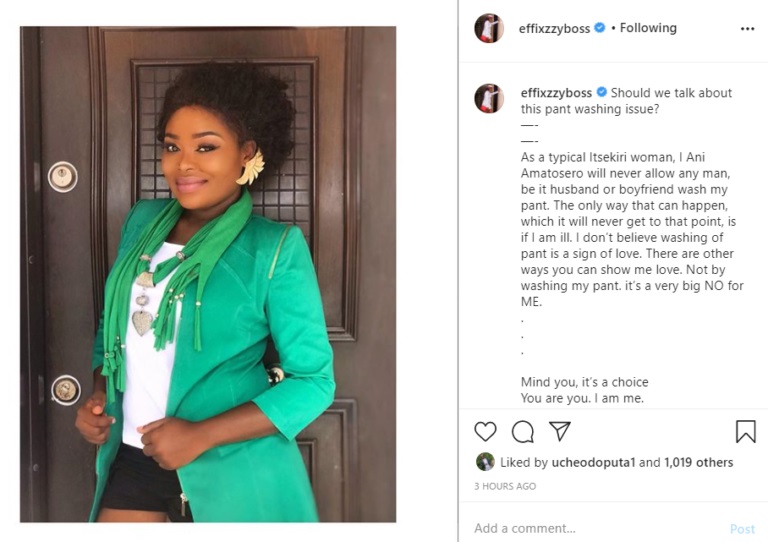 According to Ani, she will never allow any man, be it husband or boyfriend wash her pant, except she is ill. She also said she doesn’t believe washing of pant is a sign of love, that there are other ways to show love.
