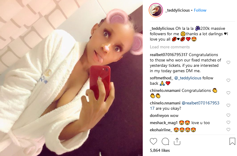Nollywood actress who goes by the name Chisom teddylicious on instagram shared this cleavage revealing photo to celebrate 200k instagram followers, though she previously suffered depression but seem to be fine now…