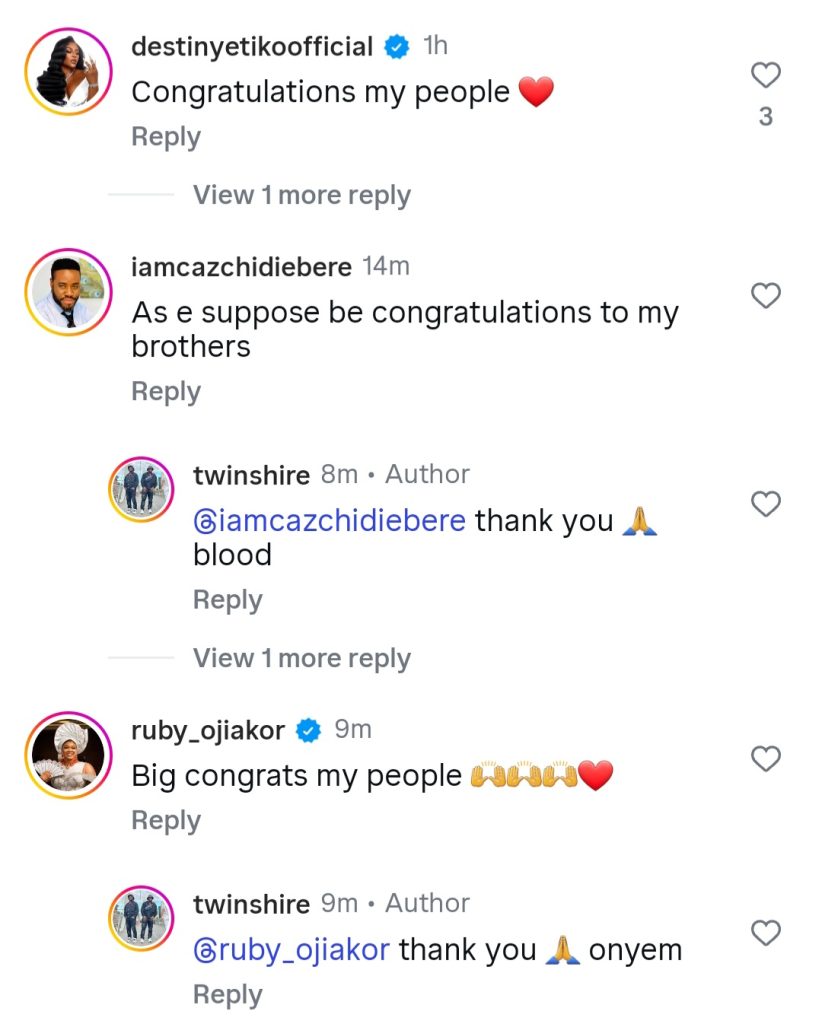 Nollywood actors have left congratulatory messages for them, wishing them well on their wedding and on their birth of their daughters.