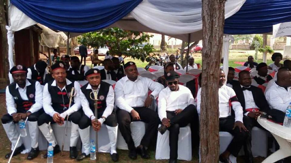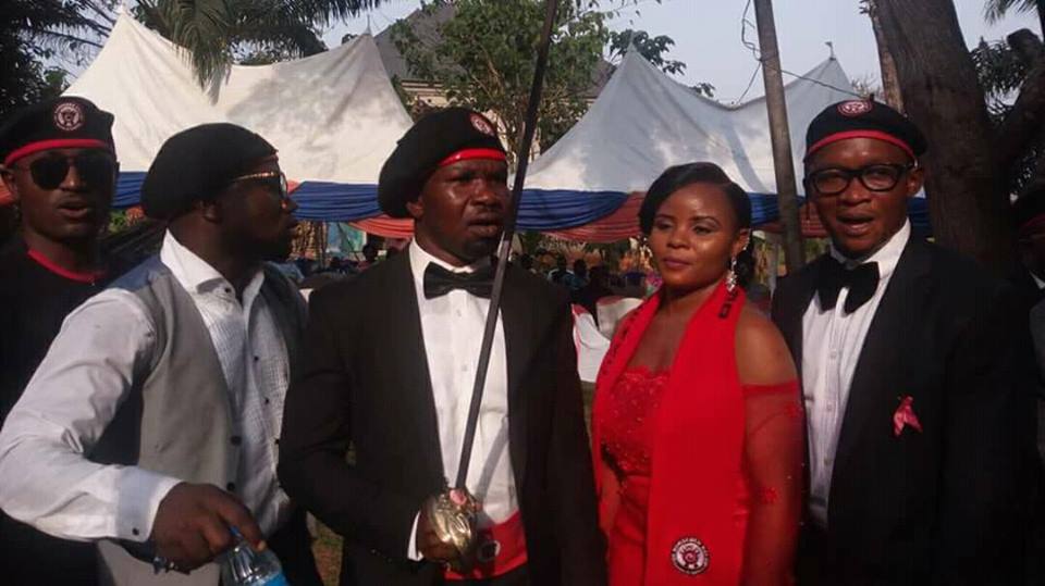 A member of the De Norsemen Kclub of Nigeria popularly known as Norsemen confraternity tied the knot to his lovely bride in a very colorful wedding (literally) yesterday. The confraternity members who donned white, red and black attire with their swords – came in their numbers to show support for their top member at his wedding. Congratulations to the latest couple in town.