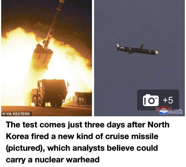 Kim’s regime typically uses the phrase ‘strategic weapon’ to refer to nuclear missiles, leading analysts to conclude that it could be the North’s first cruise missile that is able to carry a nuclear warhead.