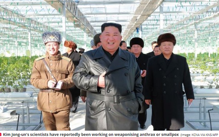 The authors say that Kim’s scientists have been working on weaponising anthrax or smallpox, and potentially mounting them on missiles to use against South Korea or the US.