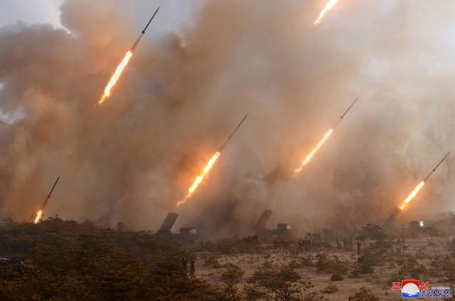 Photos released by KCNA showed troops firing a number of artillery guns, as well as missiles from a multiple-launch rocket system (MLRS) with four launching tubes.