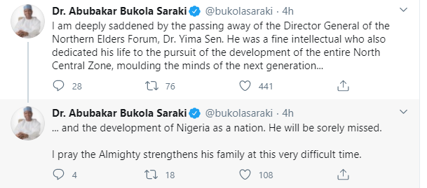 “I am deeply saddened by the passing away of the Director General of the Northern Elders Forum, Dr. Yima Sen. He was a fine intellectual who also dedicated his life to the pursuit of the development of the entire North Central Zone, moulding the minds of the next generation and the development of Nigeria as a nation. He will be sorely missed. I pray the Almighty strengthens his family at this very difficult time”.