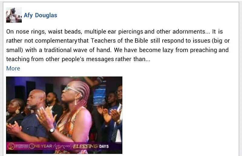 “On nose rings, waist beads, multiple ear piercings and other adornments… It is rather not complementary that Teachers of the Bible still respond to issues (big or small) with a traditional wave of hand. We have become lazy from preaching and teaching from other people’s messages rather than personal study and research,” he wrote.