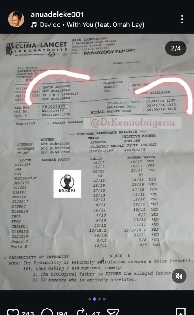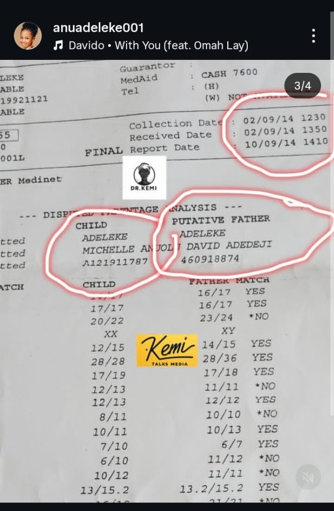 In a fresh Instagram post, Ayo shared an existing DNA test result contradicting Davido’s earlier claim.